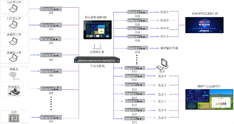 2.分布式中控、音频、视频一体化应用。部署方便、使用灵活、维护简单。