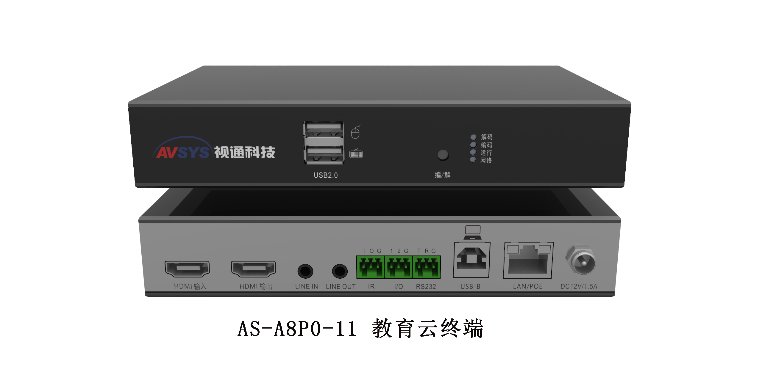 AS-A8P0-11教育云录播主机,是一款同时支持编码和解码的录播主机。设备采用Linux嵌入式操作系统及专用硬件平台;集成图像编码、解码、多画面合成、录制及可编程中控应用等多功能于一体。B/S后台管理系统,查看音视频直播,点播,设备控制,功能配置,系统维护,系统状态查询。产品采用高性能国产化嵌入式处理器。高达6路1080P30或1路4K30实时解码和1路4K30编码能力的CPU,可轻松应对越来越高的高清应用和网络需求;集成优异的视频前后处理和编解码算法、结合多路高清显示输出能力,能充分满足客户产品的高质量图像体验。高度集成和丰富的外围接口,高度集成和丰富的外围接口,多样化特色功能,满足教育行业常态化录播、督导巡课的应用。