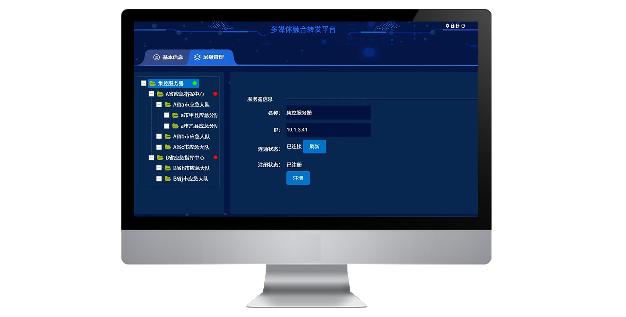 采用分布式云技术,进行三级单位权限管理,采用注册方式实现多级指挥调度视频云统一管理与调度。