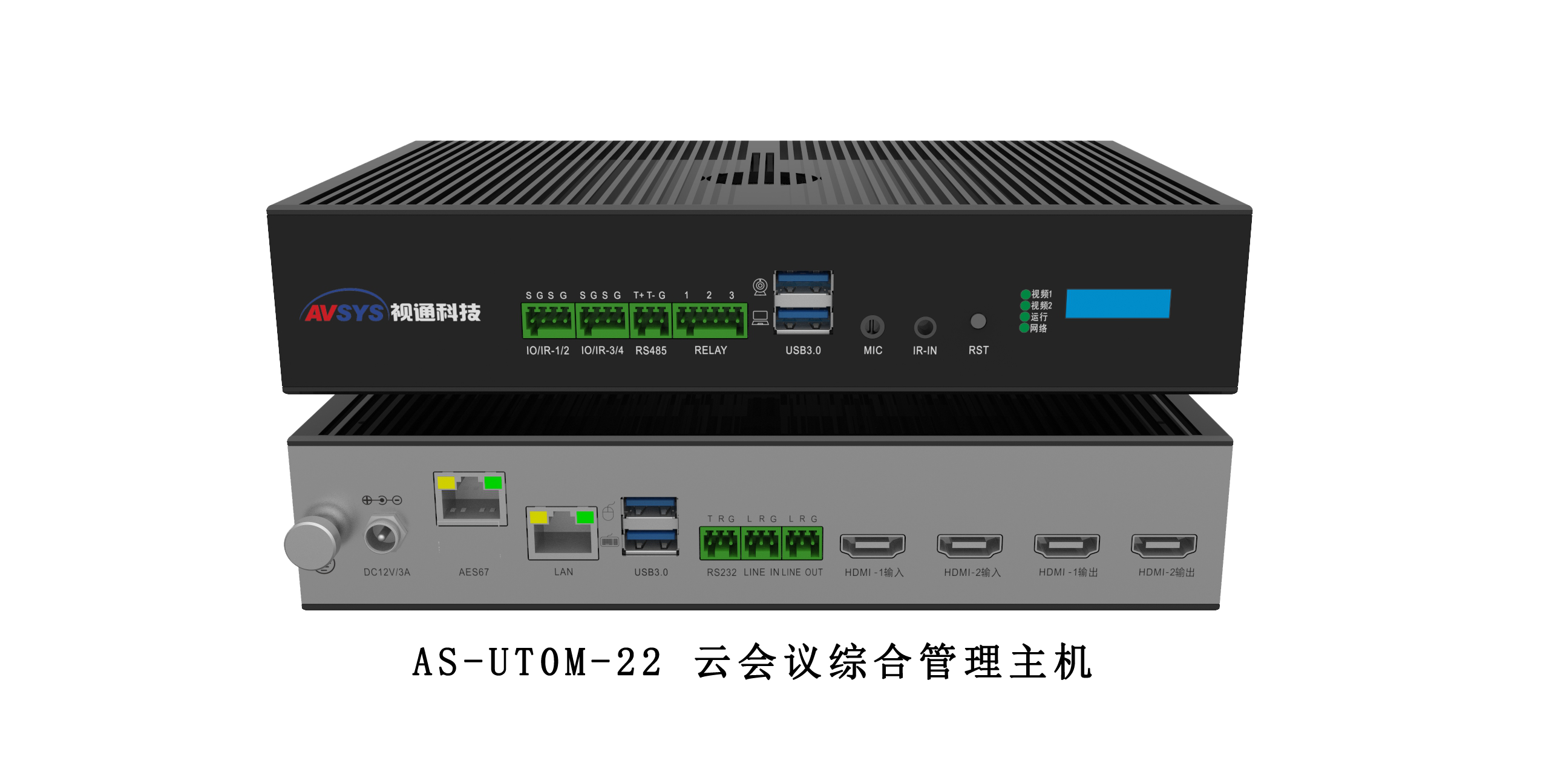 AS-UT0M-22 是一款多功能,支持本地视频切换、本地环境控制、远程音视频会议、互动培训、虚拟场景搭建以及视频录制功能的迷你型综合管理主机。同时设备具备UV/AC数据传输能力,可对接常见的音视频交互软件。主要应用于线上会议、网络教育以及电商等应用场景。